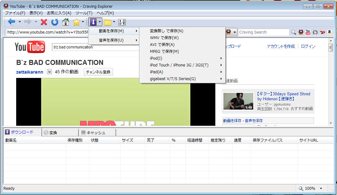 Craving ExplorerでYouTubeをいきなりmp3にできます。↓ ![]() クリックで拡大。 http://www.crav-ing.com/ YouTubeやニコニコ動画でダウンロードできなくなった場合、 Craving Explorerの方で対処してくれる場合がありますので、 いつも最新版を使うようにしましょう。 保存先が分からなくならないように、ツール - Craving Explorerオプション の「保存先」でデスクトップを指定しておきましょう。 動画のまま保存することも、mp3にすることも自由自在。 動画鑑賞はWindows Media Playerなどで可能。 この頃、YouTubeでは高画質なmp4という形式でダウンロード SmileDownloaderというソフトを使ってYouTubeのFLVファイル (YouTubeの正体、Flashの動画)をダウンロードします。 http://janesoft.net/downloader/ ダウンロードツールはいずれもIEの右クリックを利用しています。 |